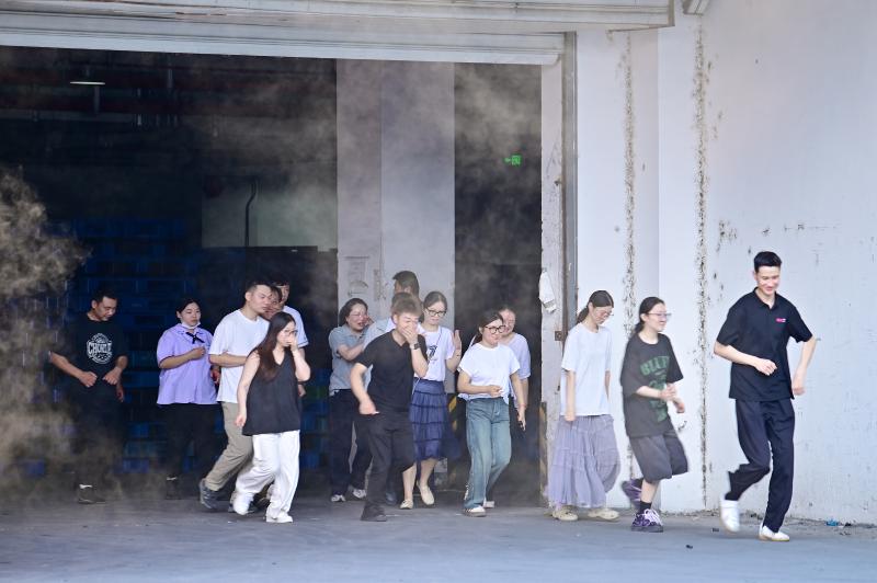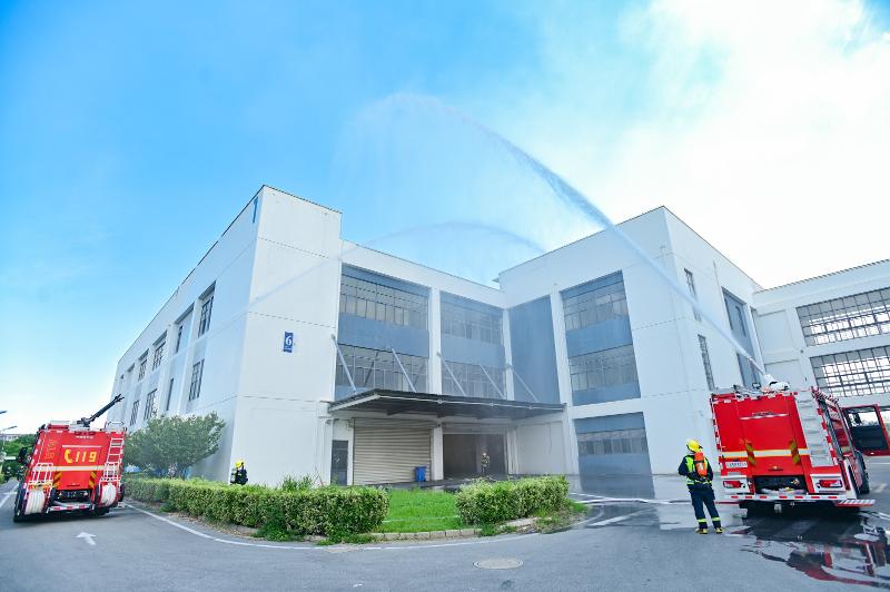 演練模擬臺風天氣下,恒創智能制造園因臨時線路受損短路引發火災,火勢蔓延至鋰電池倉庫,且救援中發生人員受傷的緊急場景。警報觸發后,企業迅速啟動自救,組織員工捂鼻低姿有序疏散,微型消防站隊員攜裝備處置初期火情,東沙湖基金小鎮安全分聯盟應急互助隊伍也前來支援。隨后,119消防車呼嘯而至,出水滅火,120急救人員抬著擔架沖進現場,緊急救治受傷人員。