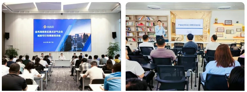 商務區通過開展涉氣企業專項幫扶、組織產業載體環境管理規范化建設培訓班、舉辦無組織廢氣自行監測沙龍、召開樓宇餐飲油煙治理宣貫會等方式,為轄區相關企業、載體提供專業化指導與技術支持,優化排放管理,攜手守護園區“天空藍”。