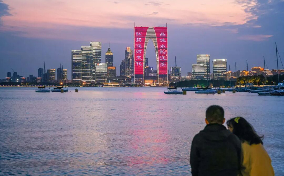 清晨至日暮,隨處可見結伴而行的游客與市民,他們手持手機,沿著波光粼粼的湖岸線,開啟了一場別開生面的“打卡尋愛”之旅。從金雞驛01的起點出發,現代地標東方之門是必拍的背景板;信步至蘇州中心商場,新開的特色首店成為旅程中的驚喜插曲;在充滿藝術感的《圓融》雕塑前,人們尋找著最佳光影角度;而李公堤的中法愛墻前,更是人頭攢動,不同語言的“我愛你”成為無數情侶定格深情瞬間的浪漫見證。
