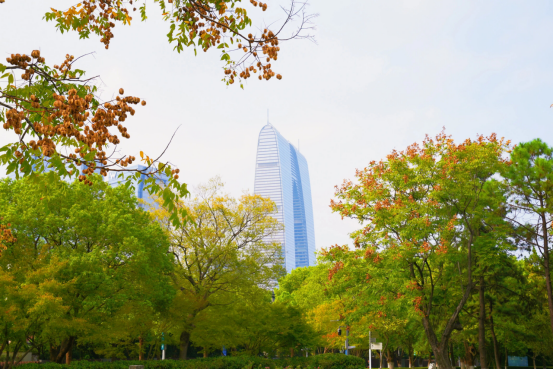 盡日苔階閑不掃滿園銀杏落秋風銀杏則是秋日里期待的另一抹亮色待一簇簇金黃扇葉綴滿枝頭自然勾勒出天然畫框恰好將遠處的城市地標框進這幅秋景圖中