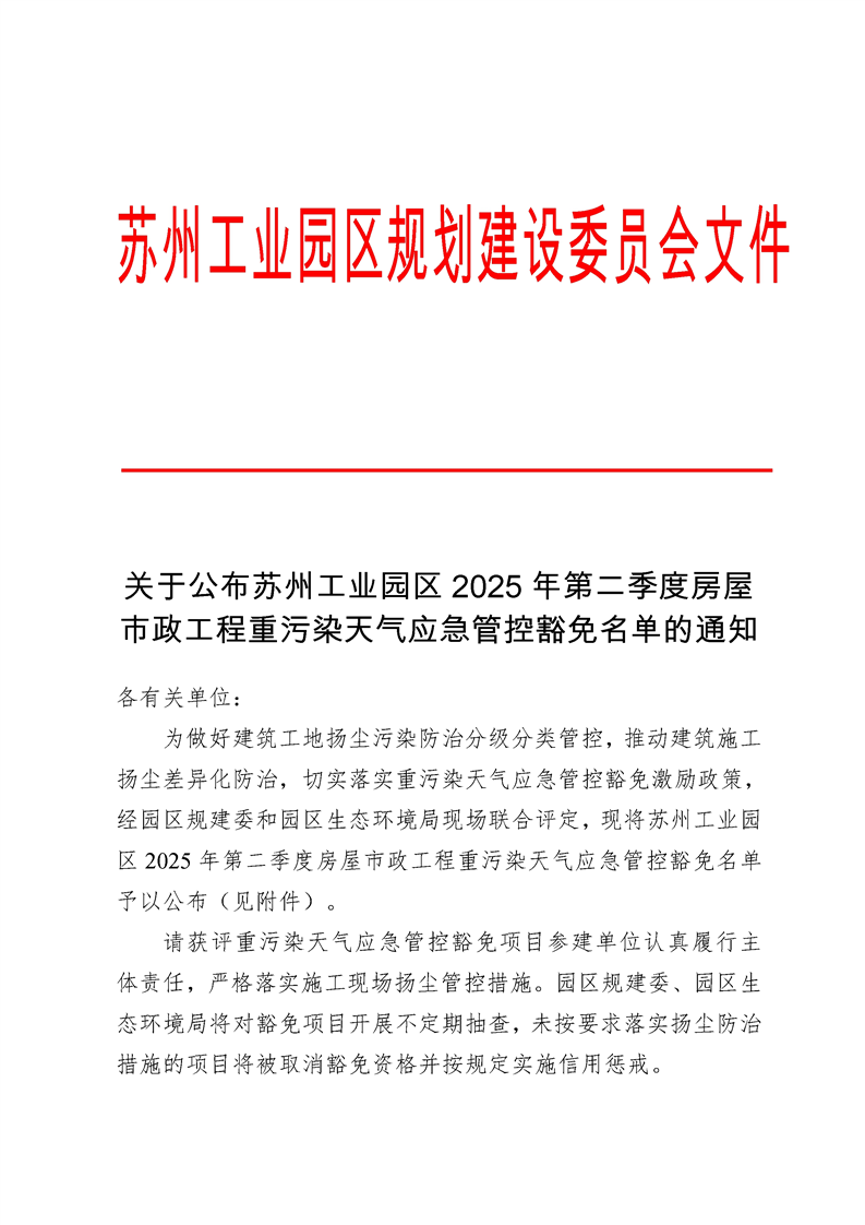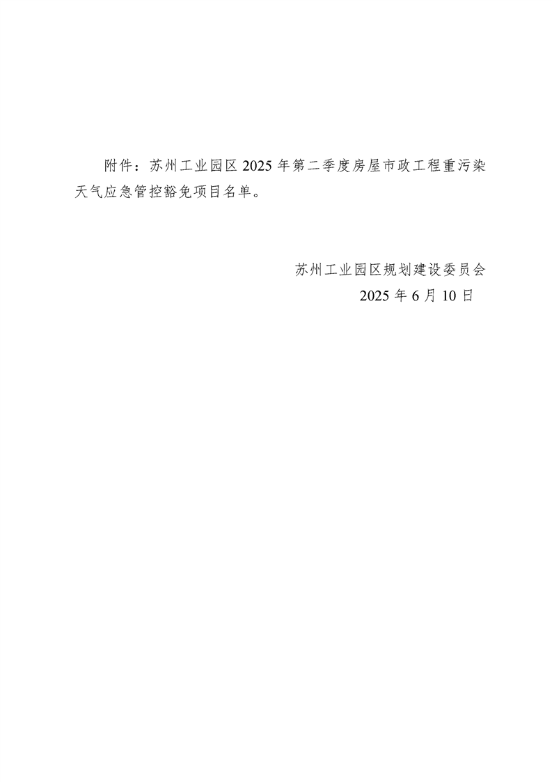 關于公布蘇州工業園區 2025 年第二季度房屋市政工程重污染天氣應急管控豁免名單的通知
