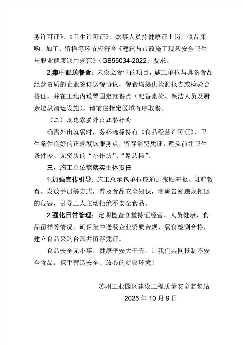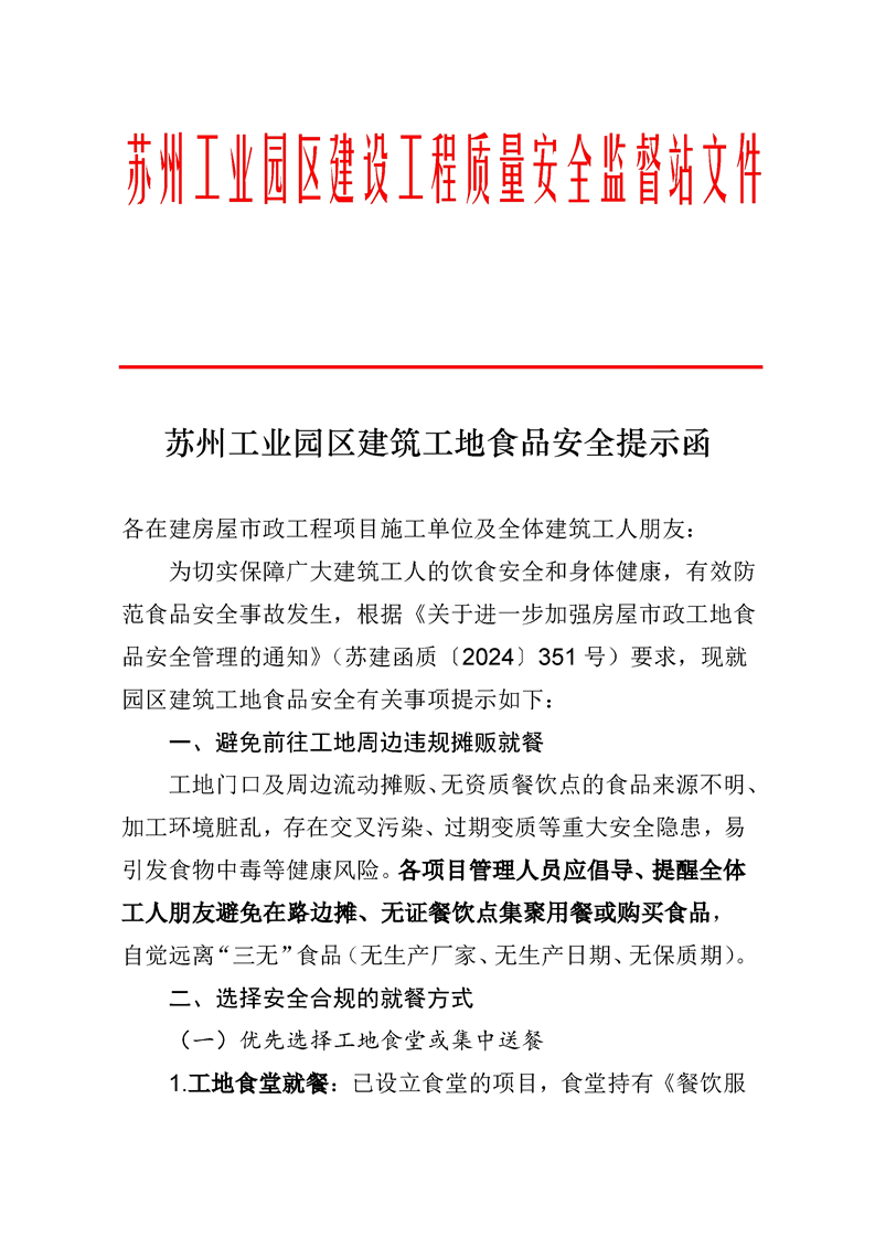 蘇州工業(yè)園區(qū)建筑工地食品安全提示函