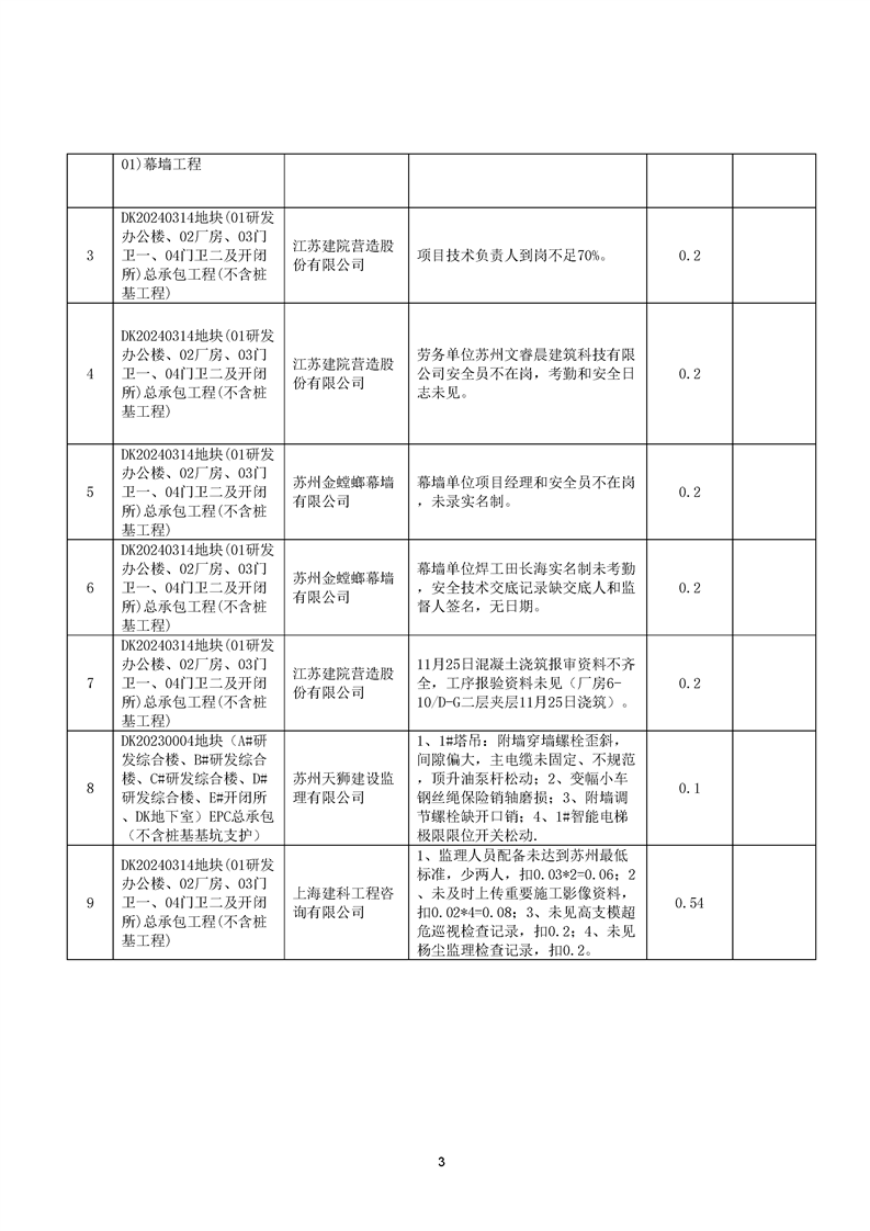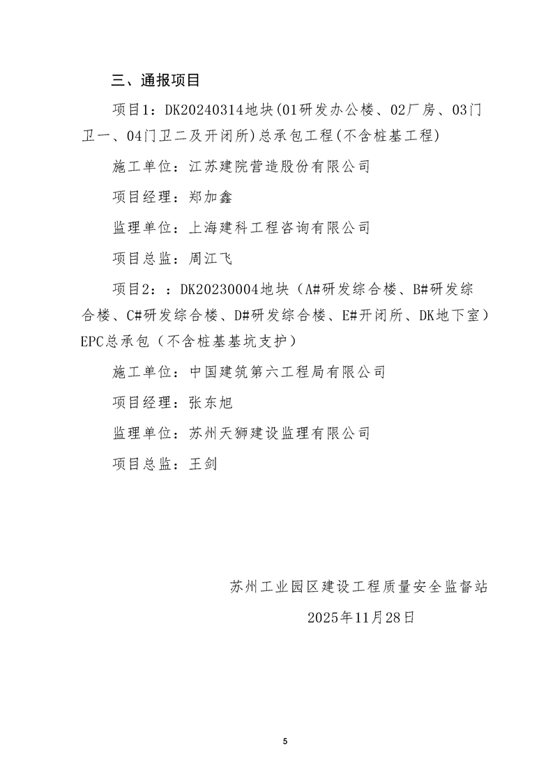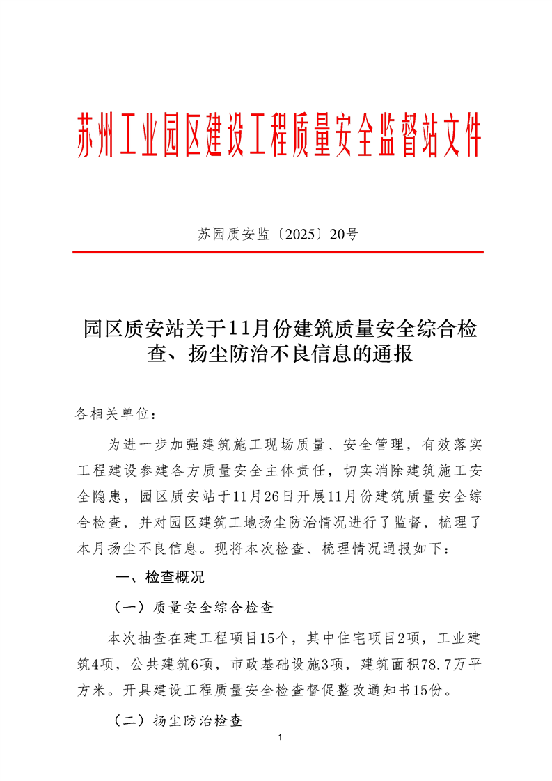 園區質安站關于11月份建筑質量安全綜合檢查、揚塵防治不良信息的通報