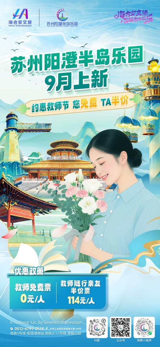 9月2日至14日,蘇州陽澄半島樂園為教師送上專屬文旅福利,致敬每一位辛勤耕耘的教育者。教師憑本人教師資格證可免費入園,還能攜帶最多2位好友,享受好友半價入園的特權。