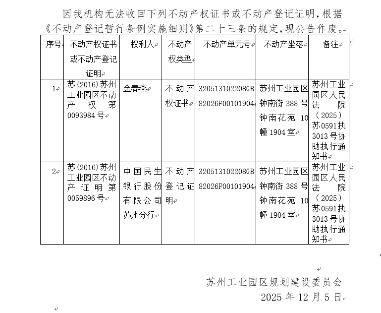 不動產(chǎn)權(quán)證書/登記證明作廢公告蘇園 證廢字2025(0181)號(鐘南花苑10幢1904室)