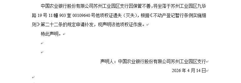 關于蘇州工業(yè)園區(qū)九華路19號11幢903室00109640號他項權證遺失聲明