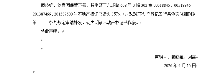 關(guān)于東環(huán)路658號3幢302室00518845、00518846、201387499、201387500號不動產(chǎn)權(quán)證書遺失聲明