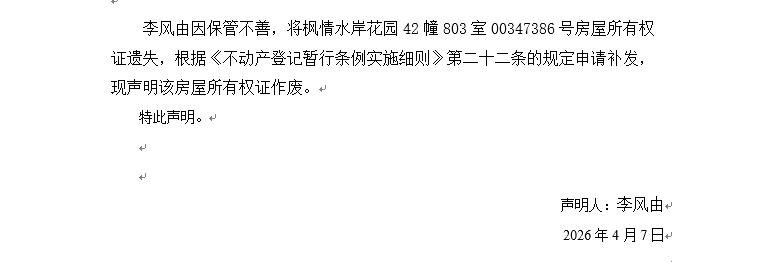 關于楓情水岸花園42幢803室00347386號房屋所有權證遺失聲明