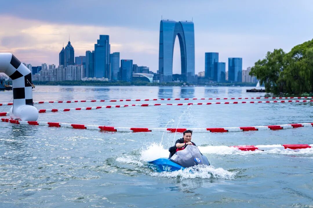 不遠處的金雞湖南岸,更是熱鬧非凡。水上摩托拖曳出炫目的白色尾浪,立式槳板瑜伽愛好者們在落日余暉中同步舒展身姿,完成一整套“樹式”動作。人群之中,甚至有一位戴著京劇臉基尼的大爺,踩著電動沖浪板悠然穿梭,引來陣陣喝彩。截止8月底,金雞湖水上游暑期累計接待游客超100000人次,吸引超20000人次登島游玩,較2024年同期增長48.71%。據新時代集團文博商旅公司相關負責人介紹,2025桃花島仲夏嗨游季打造了水上卡丁船、叢林穿越等30多場活動業態,深度融合生態特色與潮流體驗,全面覆蓋親子家庭、青年群體等多年齡段及興趣圈層。