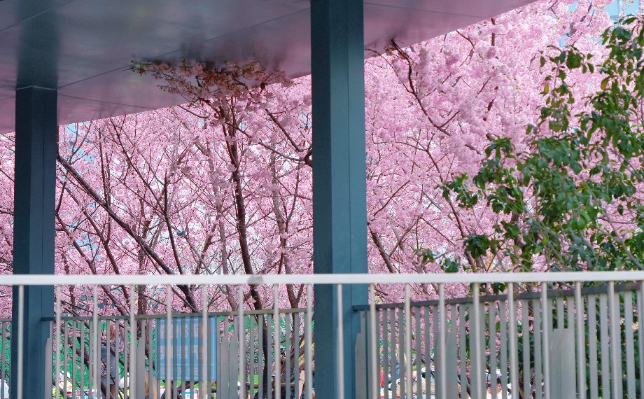 錦溪公園內(nèi),椿寒櫻開得熱烈,滿樹繁花如云似霞,白日里花影綽約,晚間夜櫻與藍調(diào)天空相映成趣,燈光勾勒花影,氛圍感十足,別有一番靜謐溫柔的景致。現(xiàn)代大道旁,新城鄰里中心門口,早櫻也盡數(shù)盛放,柔粉色花瓣隨風輕舞,路過的行人紛紛駐足定格美好,來一場愜意citywalk,自在又舒心。