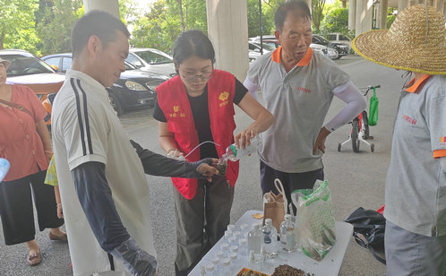 活動(dòng)通過創(chuàng)意海報(bào)展示、養(yǎng)生知識(shí)分享及互動(dòng)體驗(yàn)環(huán)節(jié),向居民傳遞了豐富的夏季養(yǎng)生知識(shí)。海報(bào)圍繞“夏季飲食調(diào)養(yǎng)”“防暑降溫小貼士”“運(yùn)動(dòng)養(yǎng)生法”等多個(gè)主題展開,圖文并茂地介紹了如何在夏季保持身體健康。最吸引眼球的莫過于自制驅(qū)蚊水環(huán)節(jié)。居民們將簡單易得的材料按比例混合,一瓶既安全又有效的驅(qū)蚊水便誕生了。這種自制驅(qū)蚊水不僅能有效驅(qū)趕蚊蟲,還避免了使用化學(xué)驅(qū)蚊產(chǎn)品可能帶來的健康風(fēng)險(xiǎn),真正實(shí)現(xiàn)了綠色健康的防蚊新風(fēng)尚。