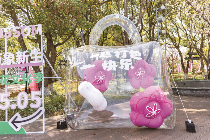 從桃花島碼頭下船登島,游人的視線很快被一片粉色浪漫所吸引。以桃花為關鍵元素,從氛圍營造到地標指引,再到裝置藝術……這個春日,桃花島被一片粉色所包圍。