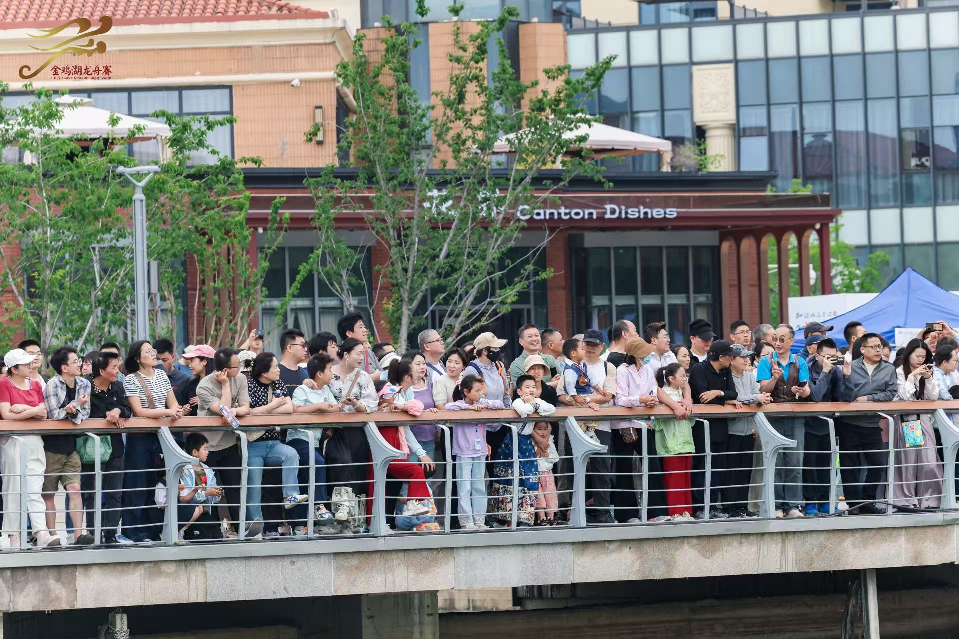 吉祥喜慶的舞龍舞獅表演,拉開(kāi)今日龍舟賽的序幕。金雞湖畔的最佳觀賽視角,早早便擠滿了人。