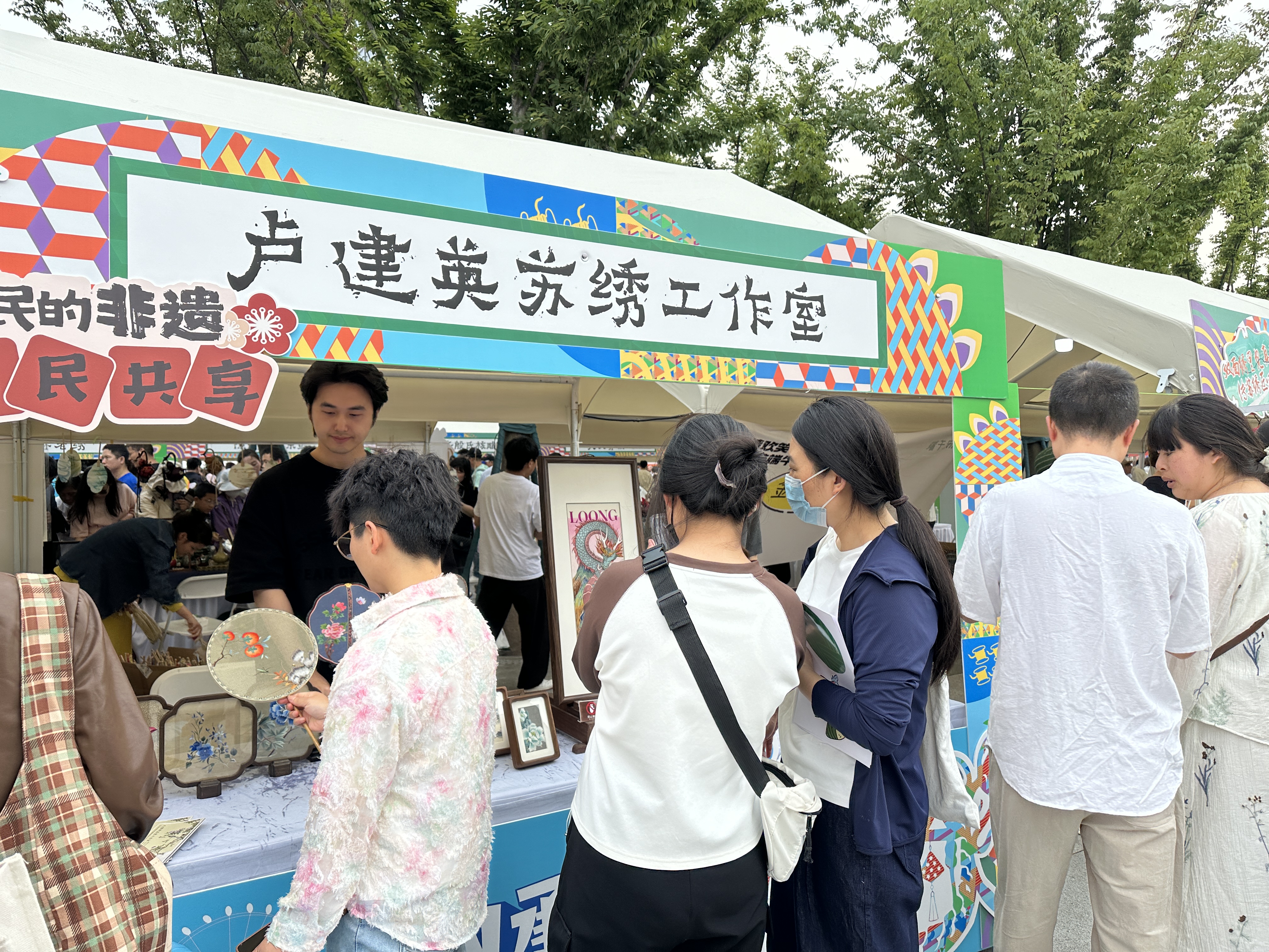 非遺新生代也帶來了眾多精彩創作。盧建英蘇繡工作室以龍年為主題二次創作的蘇繡作品,色彩明艷,造型新穎。蘇繡第四代傳承人潘乃舒介紹說:“這幅龍元素作品,正好迎合龍舟賽的主題,今天好多年輕人都被吸引過來,拿著手機不停地拍照打卡。”此外,雙面繡團扇《事事如意》、栩栩如生的龍舟競渡蛋雕作品、散發著淡淡清香的古法制香療愈系香囊等新生代作品,也讓游客們駐足觀賞,贊嘆不已。