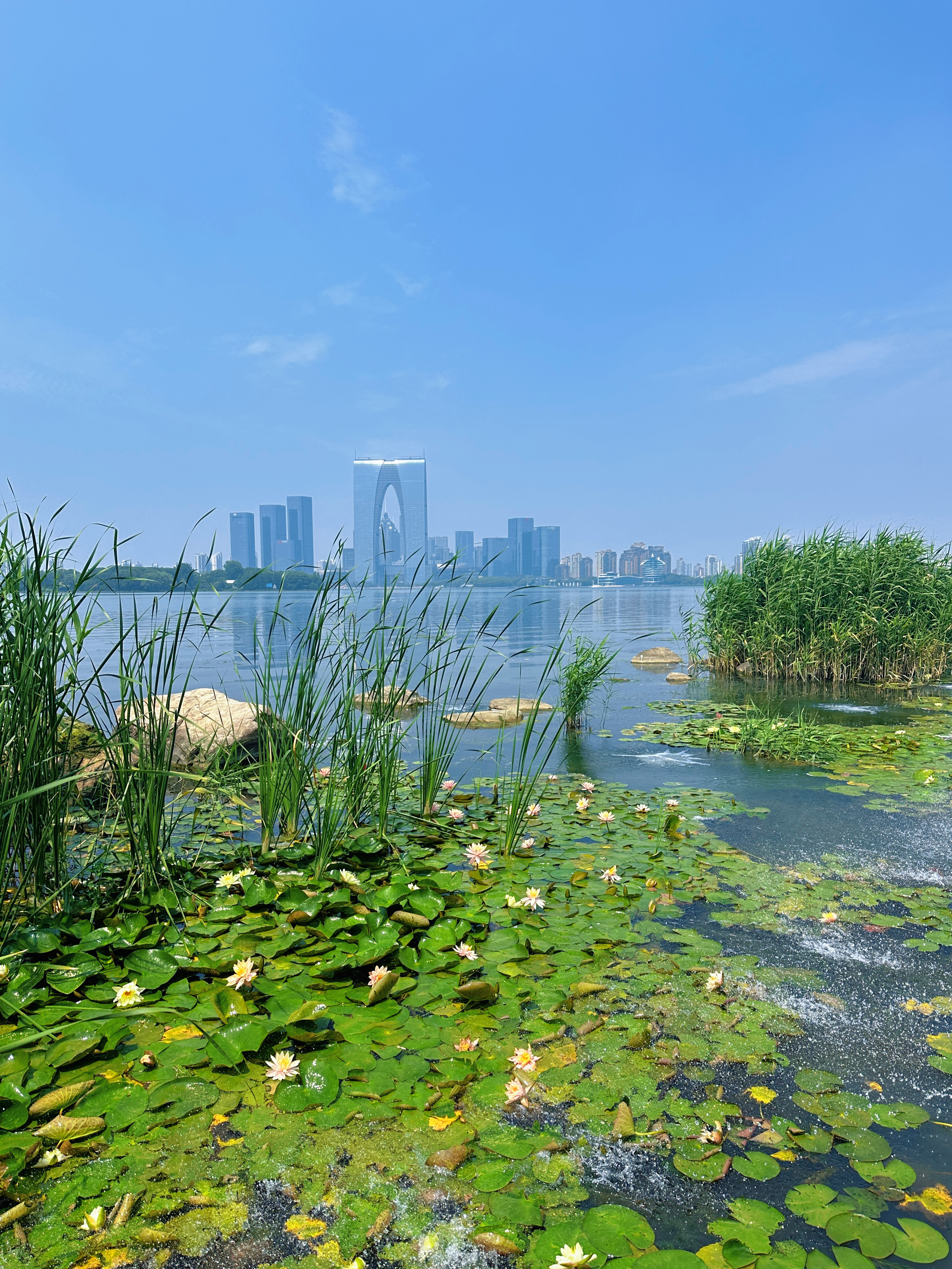 “一池睡蓮始盛開,千嬌百媚入畫來。”粉色睡蓮宛如莫奈筆下躍動的色彩精靈,層層疊疊的花瓣舒展于碧波之上,晶瑩的露珠在晨光下閃爍,似為睡蓮綴上璀璨的珠飾。她們靜靜依偎在湖面,與田田荷葉、點點浮萍相映成趣,遠處的東方之門巍然聳立,古今景致交融,勾勒出如夢似幻的畫面。三兩朵明黃色睡蓮點綴其間,為靜謐湖景增添幾分嬌俏可愛。偶有水鳥掠過湖面,驚起圈圈漣漪,更添生機。