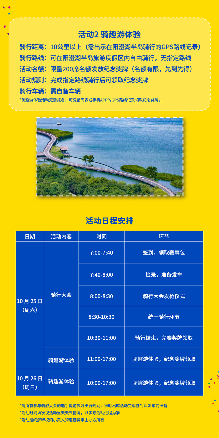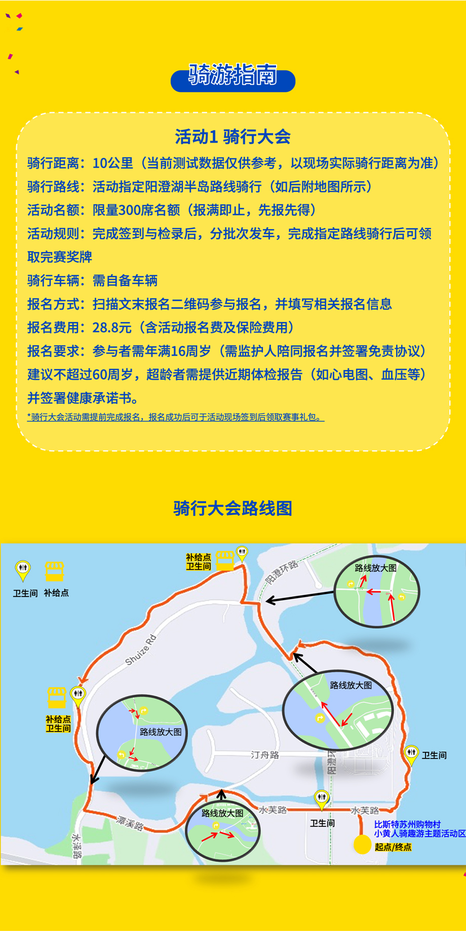 此次活動(dòng)分為騎行大會(huì)、騎趣游體驗(yàn)兩種形式,騎行大會(huì)需自備車(chē)輛、按照指定路線騎行,騎行距離約為10公里,參與者需年滿16周歲,完成指定路線騎行后可領(lǐng)取完賽獎(jiǎng)牌,報(bào)名費(fèi)用為28.8元;騎趣游體驗(yàn)也需自備車(chē)輛,可在陽(yáng)澄湖半島旅游度假區(qū)內(nèi)自由騎行,騎行距離為10公里以上(需出示在陽(yáng)澄湖半島騎行的GPS路線記錄),完成騎行后可獲得紀(jì)念獎(jiǎng)牌(限量200席名額),該項(xiàng)活動(dòng)無(wú)需報(bào)名,可憑借碼表或手機(jī)APP的GPS路線記錄領(lǐng)取紀(jì)念獎(jiǎng)牌。