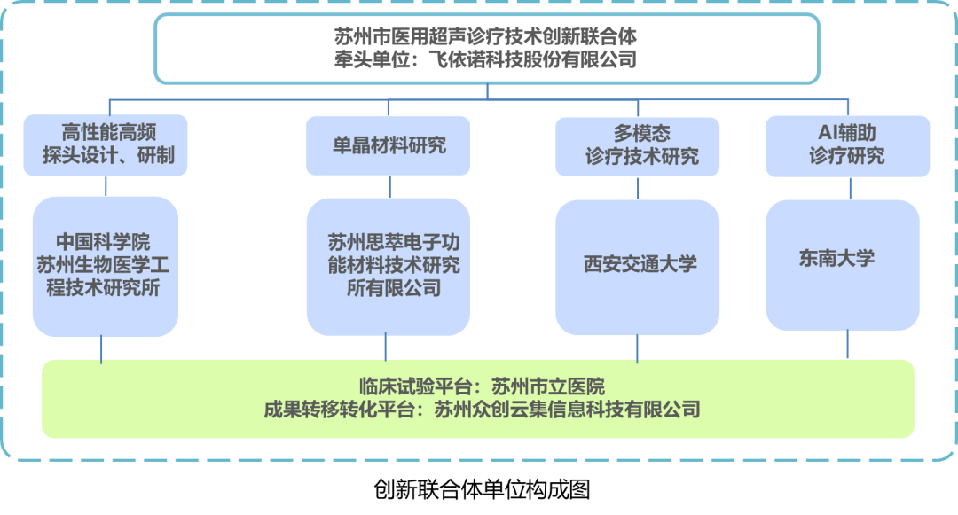 著眼于系統提升國內高端醫用超聲診療產品競爭力,在園區的支持下,飛依諾牽頭組建超聲診療創新聯合體,全面整合國內西安交通大學、東南大學、中國科學院蘇州生物醫學工程技術研究所(下稱“醫工所”)、蘇州思萃電子功能材料技術研究所有限公司、蘇州市立醫院、蘇州眾創云集信息科技有限公司等產業鏈上下游機構,形成從技術預研、聯合攻關、工程產業化到臨床應用的完整創新鏈,目標建成世界級醫用超聲診療技術創新聯合體。