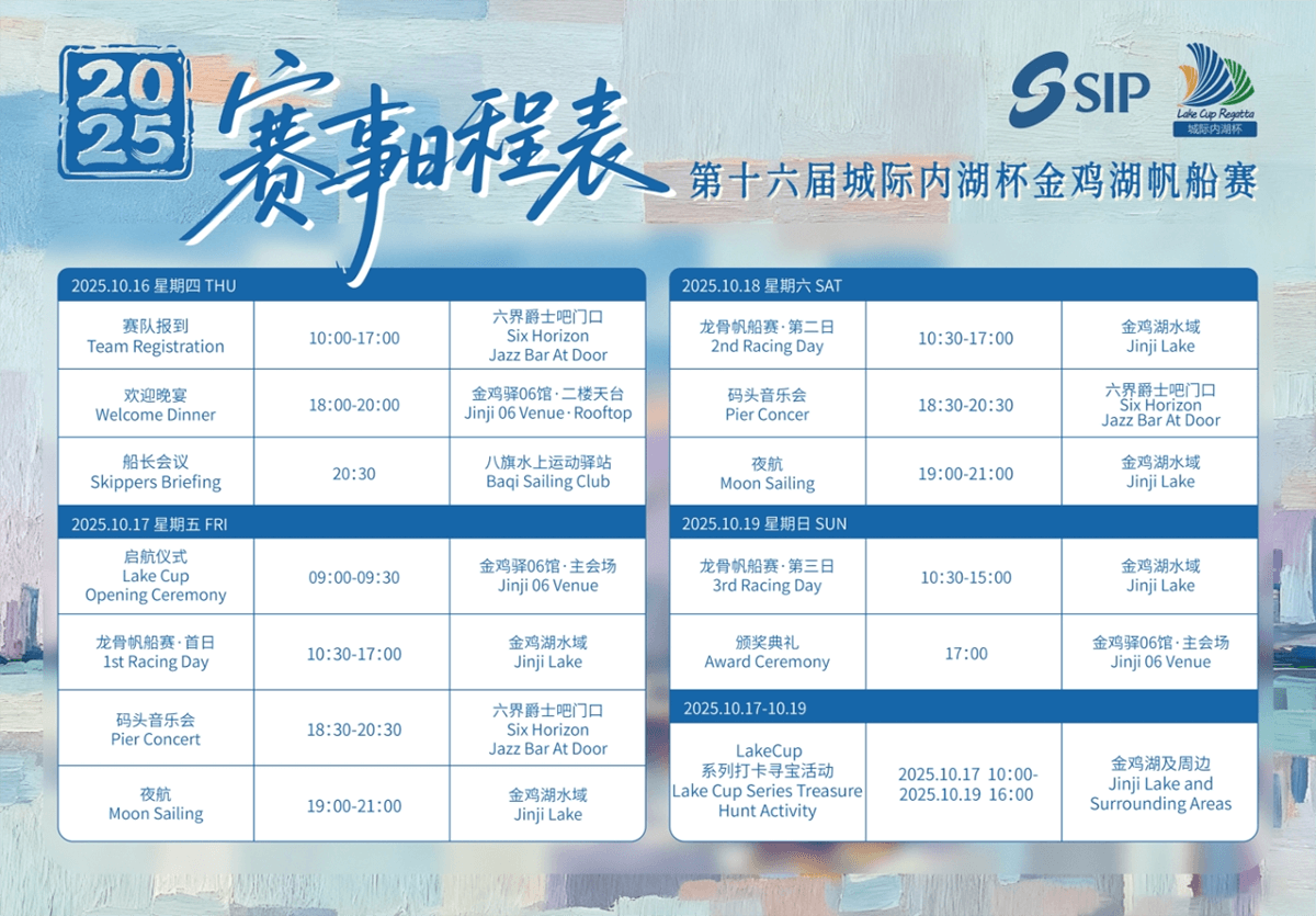 秋風(fēng)送爽,彩帆再啟。2025第十六屆城際內(nèi)湖杯金雞湖帆船賽將于10月16日至19日在蘇州金雞湖正式啟幕。作為蘇州工業(yè)園區(qū)三大品牌體育賽事之一,該賽事已成功舉辦十五屆,本屆賽事以“同帆共進(jìn),聚勢(shì)無(wú)雙”為主題,聚焦“國(guó)際競(jìng)技之力、水岸文旅之韻、全民樂活之美”三大維度,通過(guò)多國(guó)選手同臺(tái)競(jìng)技、專業(yè)與大眾相結(jié)合的賽制設(shè)置,以及體育、文化、旅游元素的深度融合,打造獨(dú)具江南文化特色的城市體育名片。群帆競(jìng)渡,共逐金雞湖本屆賽事設(shè)置專業(yè)龍骨帆船賽與大眾趣味系列賽兩大板塊。專業(yè)龍骨帆船賽涵蓋J80、DC20及FT7.5三大船型;大眾賽事則以槳板與皮劃艇為主,零基礎(chǔ)選手亦可輕松參與,體驗(yàn)水上運(yùn)動(dòng)的樂趣。賽程設(shè)置豐富多... [詳細(xì)]