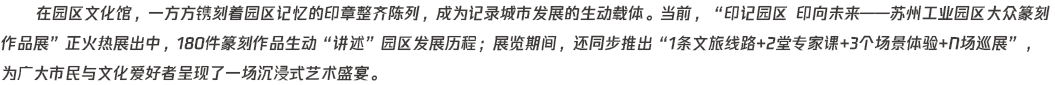 「印記園區印向未來」蘇州工業園區大眾篆刻作品展持續熱展中。傳統印面·對話當代地標,歷史印記·融合未來表達,多維創作·科技賦能,十余種創新治印... [詳細]