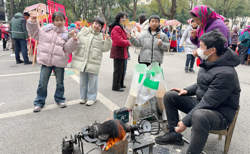 市集特別打造趣味挑戰(zhàn)區(qū),投壺、趣味抓馬等傳統(tǒng)游戲讓居民沉浸式體驗年俗樂趣。投壺攤位前,大人小孩輪番上陣,屏息瞄準、箭矢飛出,每一次中靶都引來陣陣歡呼;“趣味抓馬”游戲更是妙趣橫生,大家在互動中比拼反應力,笑聲此起彼伏。這些充滿儀式感的傳統(tǒng)游戲,不僅讓孩子們感受到年俗的魅力,也讓長輩們重溫了兒時的年味,讓傳統(tǒng)文化在歡聲笑語中代代相傳。