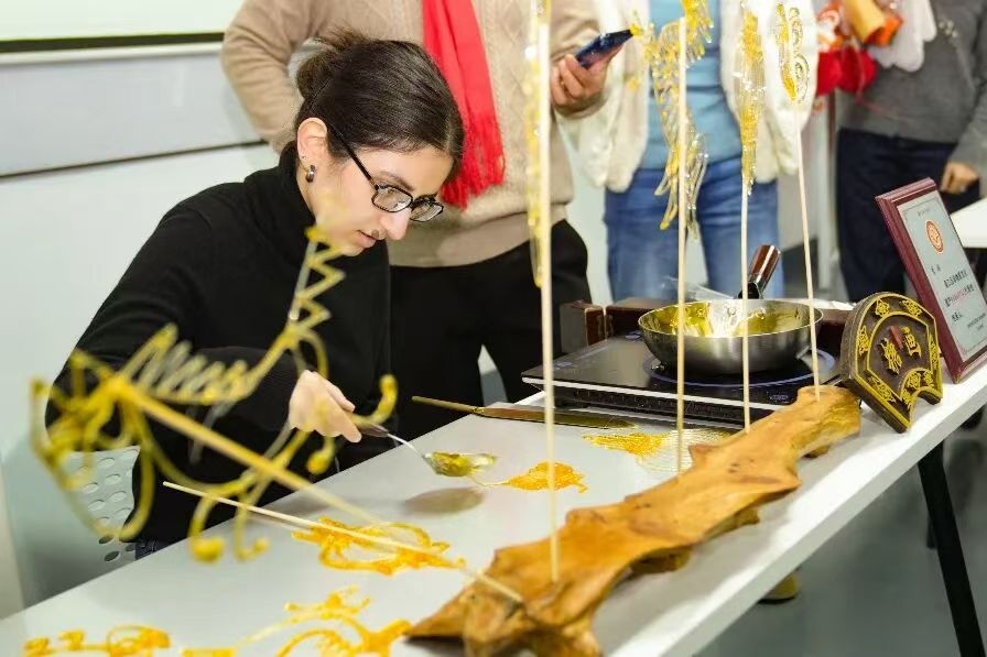 “糖畫不僅是一道美食,更是中國人對甜蜜生活、吉祥如意的寄托。”糖畫技藝傳承人李瑤的講解娓娓道來。在他的指導(dǎo)下,外籍學(xué)子們迫不及待展開體驗,他們親手執(zhí)勺、以糖為墨,嘗試勾勒出駿馬、燈籠等寓意吉祥的新春元素。金黃色的糖漿如絲綢般流淌,眨眼間,一個個生動的圖案便在光潔的石板上凝固成型,引得陣陣驚嘆。