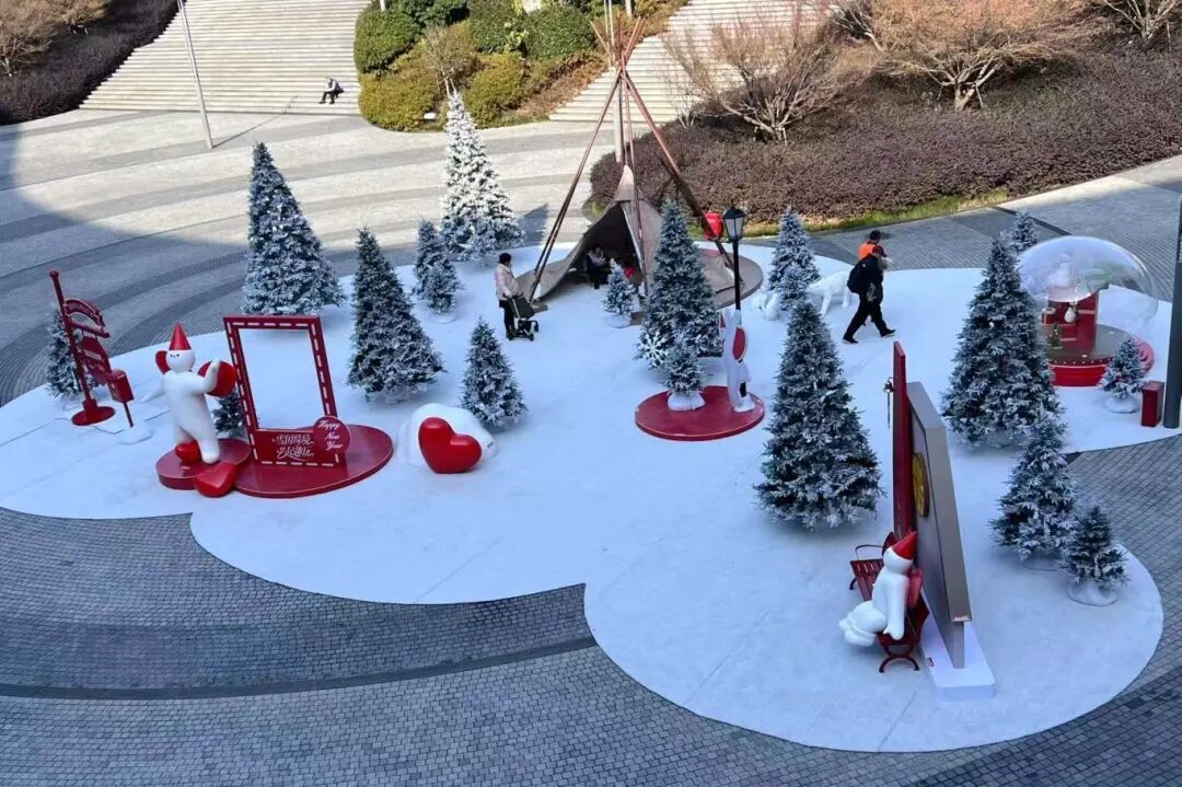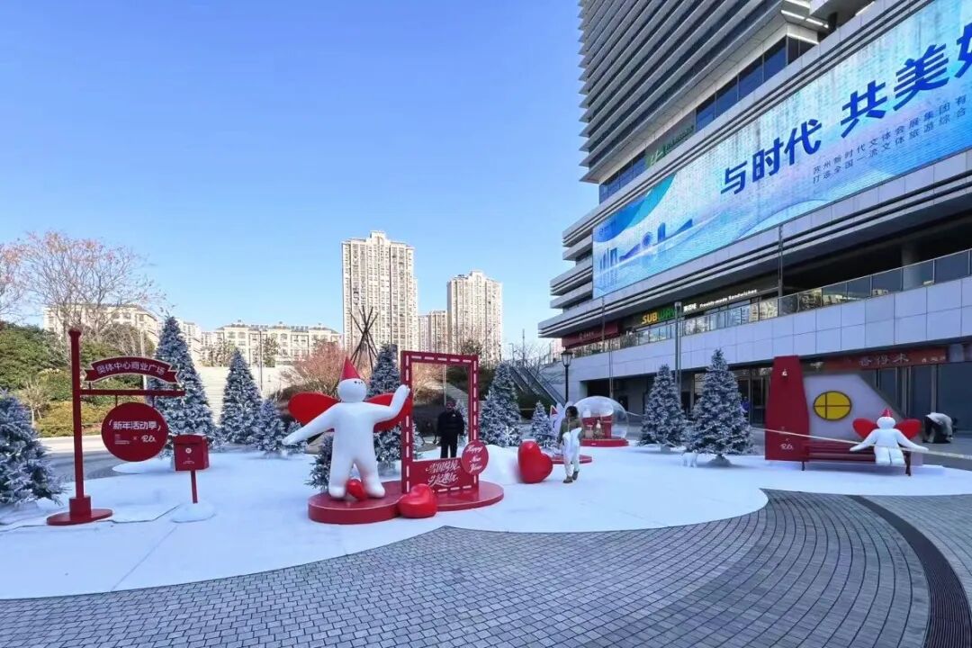 在蘇州奧體中心商業廣場,頭戴紅色尖角帽的軟萌撲拉PULA帶著對雪國的全部想象,將這里裝點成夢幻之地。鋪著仿真雪的空間里,霧凇燈串營造出冬日的松弛感,巨型水晶球裝置裝滿禮物和小雪人,雪屋休憩區和專屬打卡框則為市民游客與PULA合影留出足夠空間。
