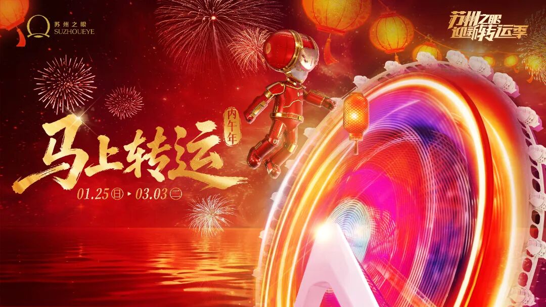 蘇州之眼摩天輪“馬上轉運”活動,以128米高空登高望遠、轉運納福為特色,融合云端特色餐飲、生肖禮遇、新春特惠、新春限定打卡贏好禮,以及剪紙、魚燈巡游、國潮電音、機器狗拜年等傳統+科技的新春互動,打造“晝夜皆景、日夜暢玩”的沉浸式年節。