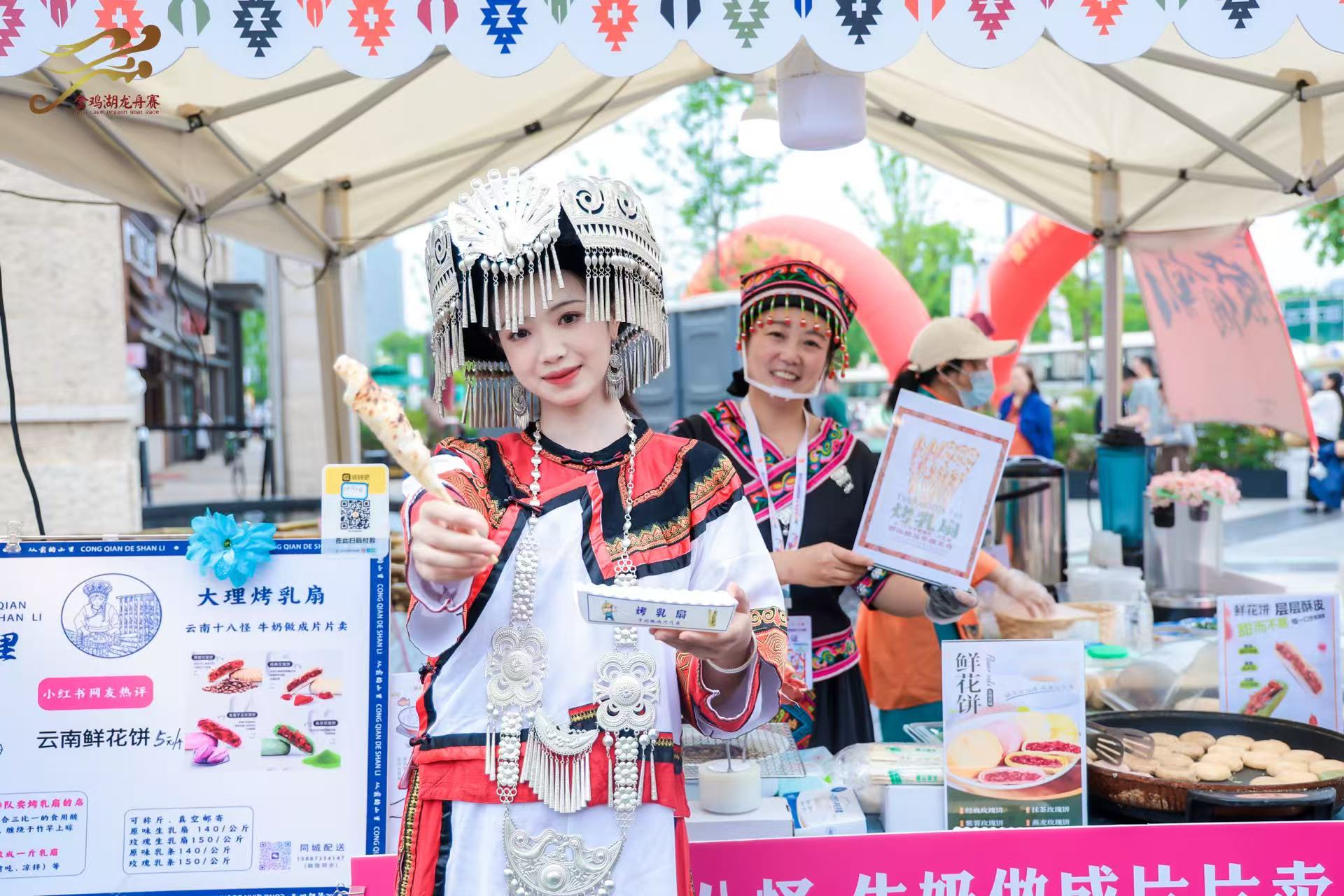 “龍舟有好市”民族美食市集同樣人氣爆棚,美食市集匯集30余個美食攤位,來自23個不同民族美食香氣四溢,打造舌尖上的“民族風”,為現(xiàn)場市民游客提供充足能量補給。剛出爐的烤乳扇滋滋作響,刷上玫瑰醬,甜香撲鼻;軟糯的朝鮮打糕裹著豆面和糖粉,引得游客們紛紛駐足購買品嘗。