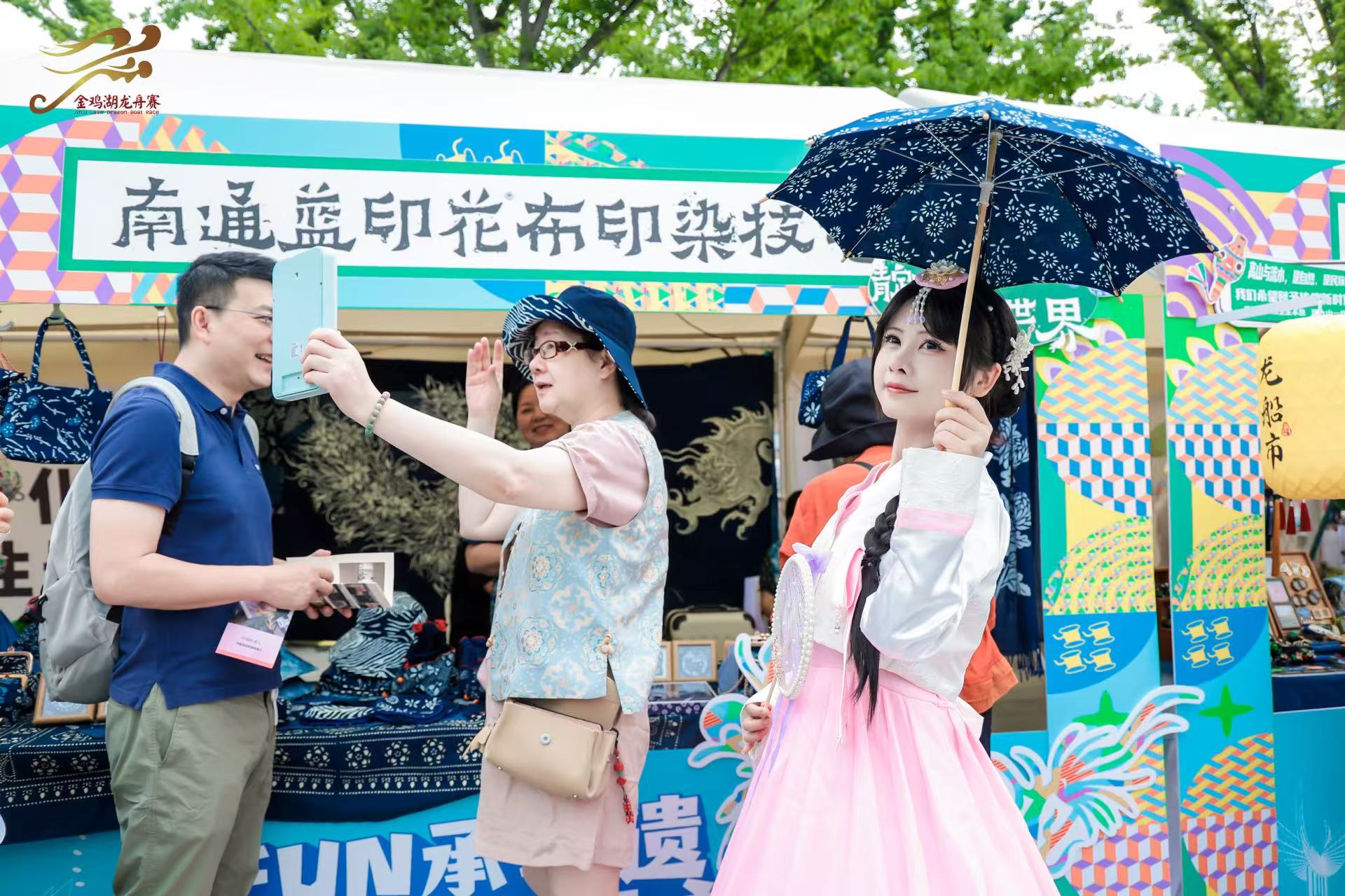 南通藍染、鎮(zhèn)江竹編、阿林老繡、貴州印染、秋和月手作纏花、山澗民族風文創(chuàng)等6項外地非遺及品牌首次參與盛會。南通藍染技藝市級傳承人曹春燕一邊耐心地向大家展示藍染制品,一邊興奮地說:“攤位上的藍染制品都是純手工制作,這次我們是第一次到金雞湖龍船市擺攤,好多小朋友都對藍印花布的制作工藝很感興趣,我們都一一介紹,這個平臺真是太棒了,給了這項古老技藝一個絕佳的推廣展示機會,讓更多人了解藍染、愛上藍染。”