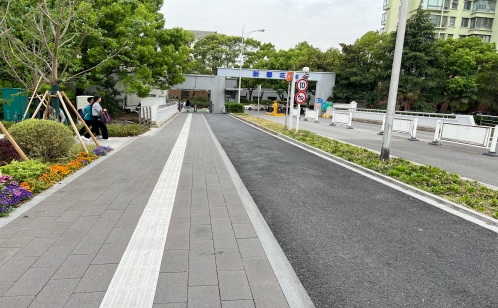在明確改造方向后,社區(qū)黨委聯(lián)合市政部門(mén)、專(zhuān)業(yè)團(tuán)隊(duì)開(kāi)展技術(shù)論證,邀請(qǐng)黨員、居民代表、物業(yè)公司共同參與。針對(duì)北門(mén)人車(chē)混行的問(wèn)題,實(shí)行行人和非機(jī)動(dòng)車(chē)分流,人行道采用防滑PC磚,非機(jī)動(dòng)車(chē)道鋪設(shè)瀝青路面,同步增設(shè)盲道,保障各類(lèi)群體通行安全與便利。方案還注重融入社區(qū)人文元素,在通道側(cè)設(shè)置“小區(qū)暖心地圖”,方便進(jìn)入小區(qū)的訪客、快遞員等快速定位樓棟,使通道在通行功能之外,也成為社區(qū)文化的展示窗口。