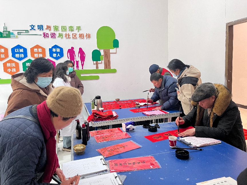 紅紙鋪展,筆墨飄香。春聯送福區域同樣熱鬧非凡。書法老師現場揮毫,筆走龍蛇間,一幅幅寓意吉祥的春聯與福字躍然紙上,將對新年的美好期許凝于筆尖。居民們或排隊等候定制書寫,或直接領取成品春聯,字里行間滿是對新春的憧憬,現場墨香與暖意交織。等候間隙,鄰里們圍坐交流養生心得與生活趣事,分享領春聯的喜悅,陌生鄰里在輕松氛圍中漸漸熟絡。