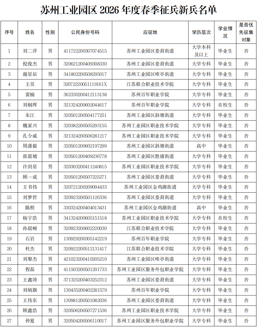 根據(jù)省、市征兵工作要求,蘇州工業(yè)園區(qū)征兵辦按照身體檢查、政治考核、役前教育、集體定兵會(huì)等程序,批準(zhǔn)了41名應(yīng)征青年入伍,現(xiàn)將人員名單向社會(huì)公布,并接受各界監(jiān)督。