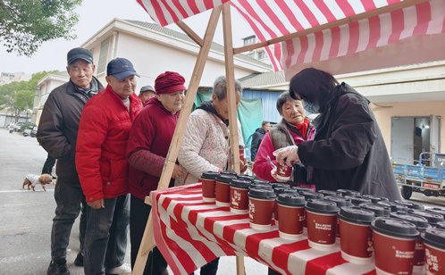 一碗熱氣騰騰的湯圓,是這場相聚中溫情的注腳。金益社區(qū)小區(qū)門口甜香四溢,社區(qū)工作人員、物業(yè)人員“紅色管家”志愿者們早早煮好湯圓,保溫靜置、分裝整齊,遞予過往居民。大家捧著溫?zé)岬拇赏耄腥爽F(xiàn)場品嘗,有人打包分享,一句句“謝謝”“趁熱吃”讓暖意在街巷間流動。志愿者們還將湯圓送到保安、保潔手中,致敬這些默默堅守一線的守護者。