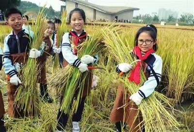 近日,蘇州工業園區星海小學的學生來到陽澄湖邊,在草鞋山考古遺址公園的古米實驗田里歡快地學割稻子,體驗農民勞作的辛苦,分享豐收的喜悅。