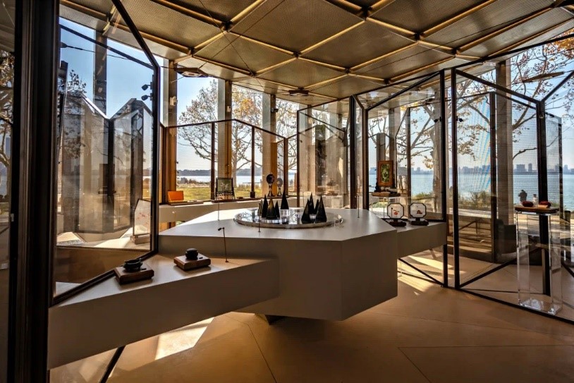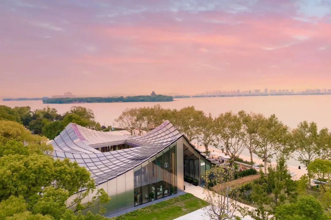 李公堤旁的金雞驛05,將雕塑動態感的竹飾面與幾何外觀結合,茶室與湖景露臺構成鬧中取靜的雅致天地,盡顯東方美學的內斂與深邃。驛站定期更新茶文化典籍,宋式設計的雅致氛圍是約上好友品茗的絕佳場所。這里曾舉辦“竹林養心錄”玉潤津生茶會,特邀茶學專家講解茶道與養生知識,竹間茶席與湖風相映,讓參與者在茶香中感受東方生活美學。
