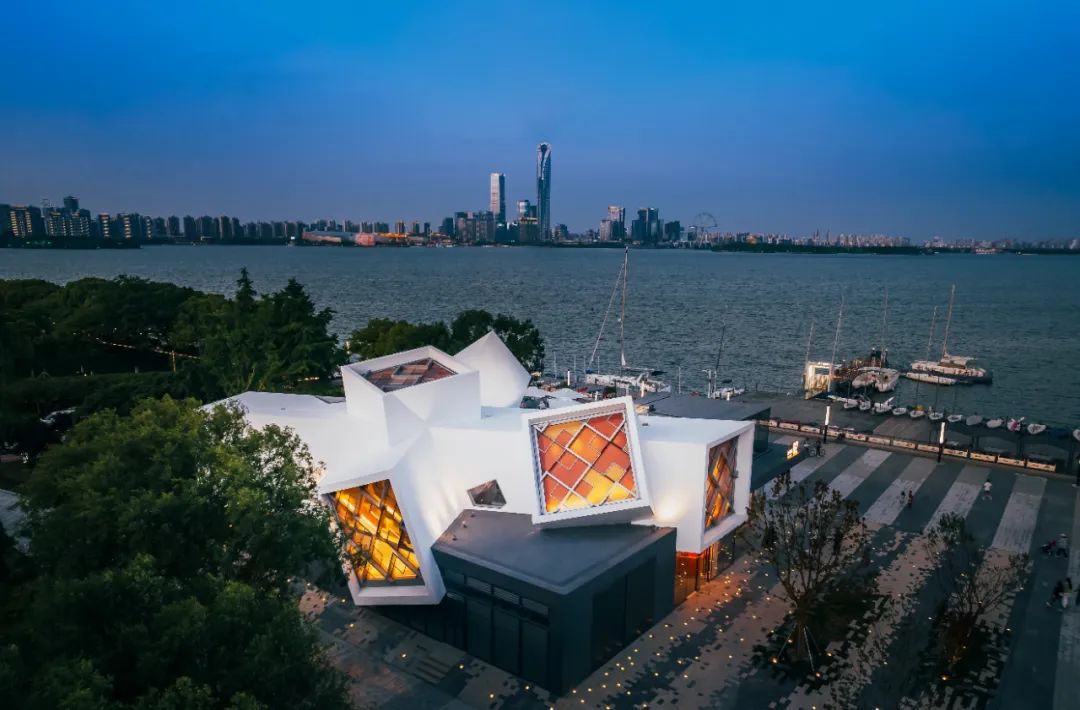 由磯崎新與胡倩工作室設計的金雞驛02,以“蘇州色卡”打造現代感空間,黑盒子基座搭配白色筒體,橙色點綴彰顯活力。驛站聯動風之園碼頭提供帆船、槳板、皮劃艇等水上體驗,市民游客可由專業教練帶領解鎖“乘風破浪”的快樂;運動后,illy咖啡吧是絕佳的補給站,冰飲與“金雞海”構成愜意組合;這里還不定期舉辦水上社群活動,讓青春活力持續綻放。