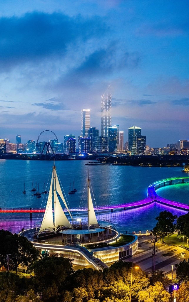 目光轉向金雞驛06,獨特的帆船造型設計成為沿湖的視覺焦點。這里不僅是蘇州市帆船聯賽等專業賽事的舉辦地,更面向市民開放帆船體驗項目,在暢游湖面之余盡覽東方之門與桃花島美景。驛站二層特別打造的全景露臺是觀賞落日的絕佳位置,隨手一拍便是夏日限定。夜幕降臨時,點杯雞尾酒靜賞湖光,或沿著彩虹橋漫步,看星光步道一點點亮起,感受別具一格的濱湖夜生活魅力。