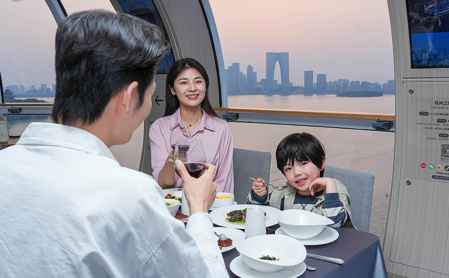 事實上,“甜蜜”不只屬于情侶。在園區(qū)“甜蜜經濟”品牌框架下,“蘇州之眼”不斷豐富其產品體系,創(chuàng)新推出“門票+”產品系列,將摩天輪與餐飲、酒店、商業(yè)、水上游覽深度融合——帶上家人,來一場“蘇州之眼+酒店”的周末微度假;約上三五好友,體驗“摩天輪+水上游覽”半日浪漫游;又或是一個人,在云端艙里安靜地看一場日落……每一次登艙,都是一次浪漫微旅行。