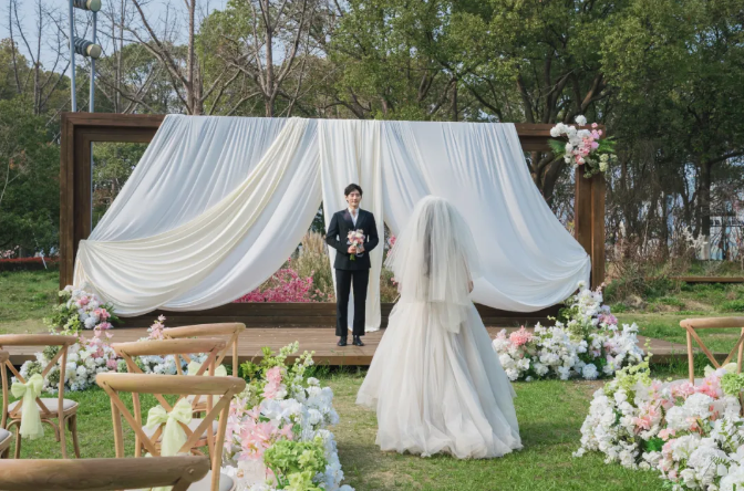 以潮流時尚婚禮為主題,桃花島還與環湖酒店夢幻聯動,從碼頭到湖心再到酒店,將對新人的祝?;魉堵搫拥奈缆贸?。同時,草坪婚禮場地結合桃林景致與湖光背景完成春日氛圍布置,可滿足新人對不同風格婚拍、婚禮的個性化需求。