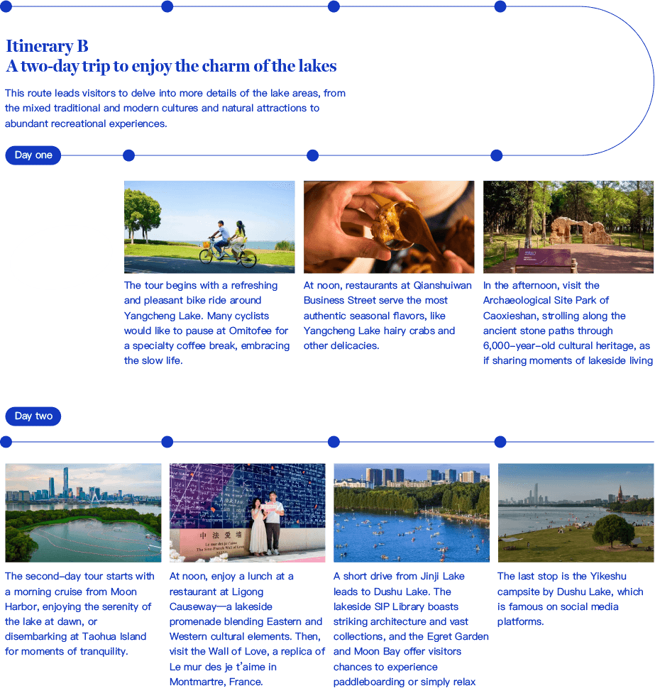 The routes were designed to allow visitors to fullyimmerse themselves in the unique charm of the three lakes in SIP and collectunforgettable memories.“We’ve integrated the most distinctive resources of thethree lakes to offer visitors a richer, more diversified travel experience,”said an official from SIP Culture, Sports and Tourism Office.Highlighting seasonal features, both routes incorporatehairy crab-themed culinary experiences. Moreover, the itineraries integratediverse experiences such as ecological exploration, trendy urban entertainment,cultur...