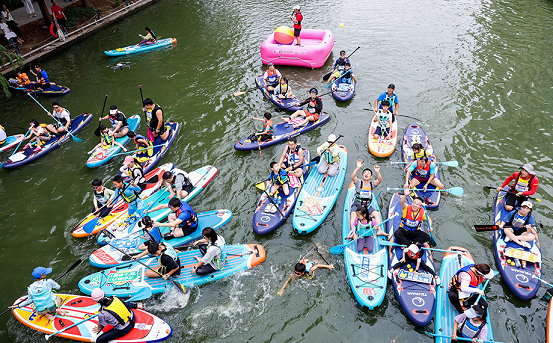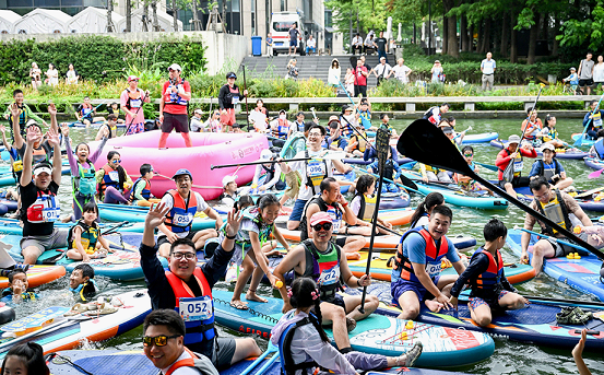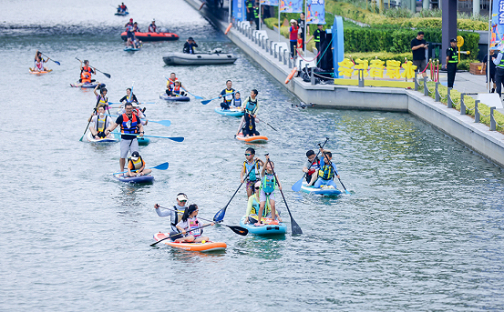 The 2025 SIP Central River Trendy Sports Meet ? Family Paddleboarding Challenge  was held at Central (Zhongyang) River in SIP on Sept 13, when 100 families showcased their paddleboarding skills and excellent teamwork.