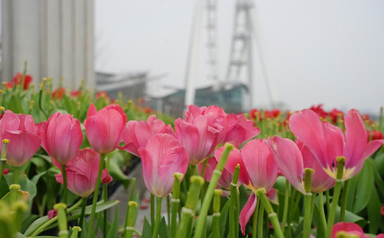 Beneath the “Flying” sculpture by Jinji Lake, a splendid sea of tulips has become a vibrant splash of color in SIP’s spring scenery. Tulips of various colors stand tall and graceful.