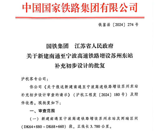 Recently, the People’s Government of Jiangsu and China State Railway Group Co Ltd (China Railway) jointly approved the preliminary design of making Suzhou East Railway Station a destination on the Nantong-Suzhou-Jiaxing-Ningbo High-speed Railway that is under construction.