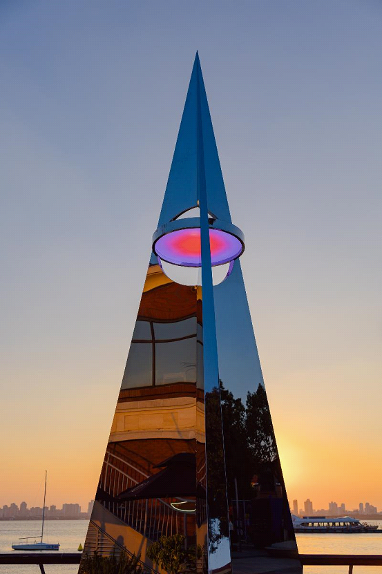 Named “Wen Jing”, one installation draws inspiration from a paper airplane and a rising rocket. Boasting polished stainless steel surfaces, it has previously toured cities like Shenzhen, Hangzhou and Shanghai, earning high acclaim. Reflecting the lake’s shimmering waves, clear skies and urban skyline, it creates an intriguing sense of spatial displacement.