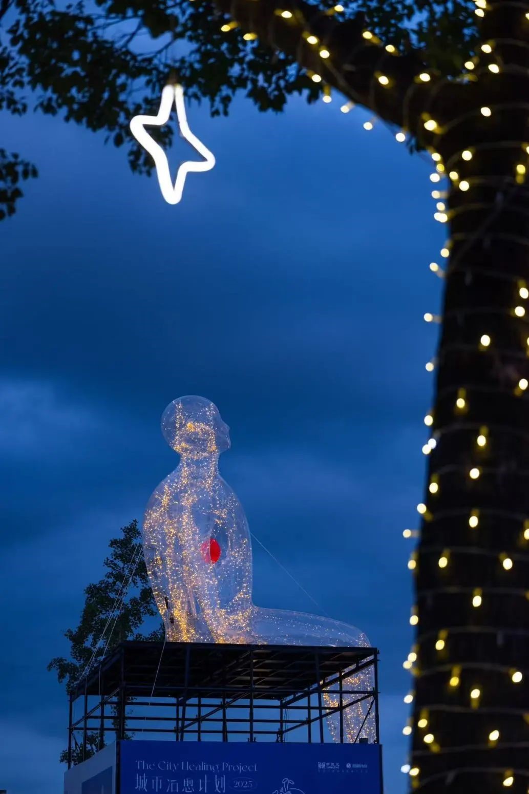 The exhibition highlights three sets of human- and animal-shaped installations featuring transparent, illuminated bodies. These artworks are designed to celebrate the harmonious co-existence between man and nature.