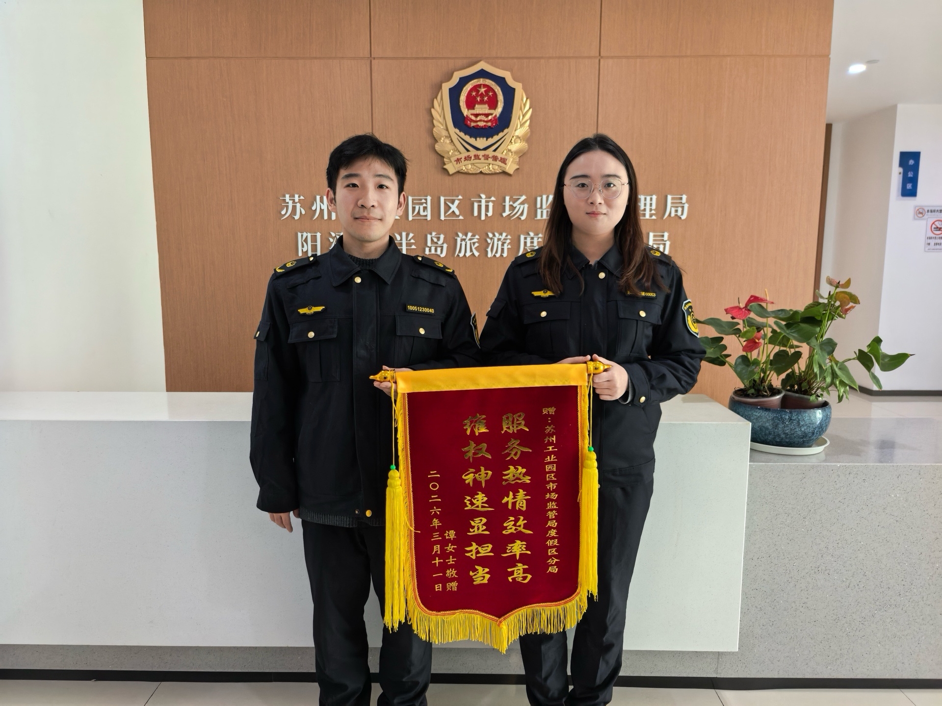 “謝謝你們的辛苦付出,為民用心服務!”3月12日,蘇州工業園區市場監督管理局陽澄湖半島旅游度假區分局收到了一面寫有“服務熱情效率高,維權神速顯擔當”的錦旗,這一份肯定源于分局高效處置的一起奢侈品消費糾紛,切實守護了消費者的合法權益。