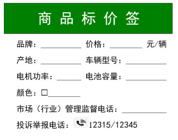、明碼標價,放心消費。經營者應當以顯著方式進行明碼標價,做到價簽價目齊全,標價內容真實準確。價格標簽或價目表等應包括品牌價格、車輛型號、計價單位、產地、顏色、電機功率、投訴舉報電話等信息。價格標簽和價目表推薦格式附后,供參考使用。
