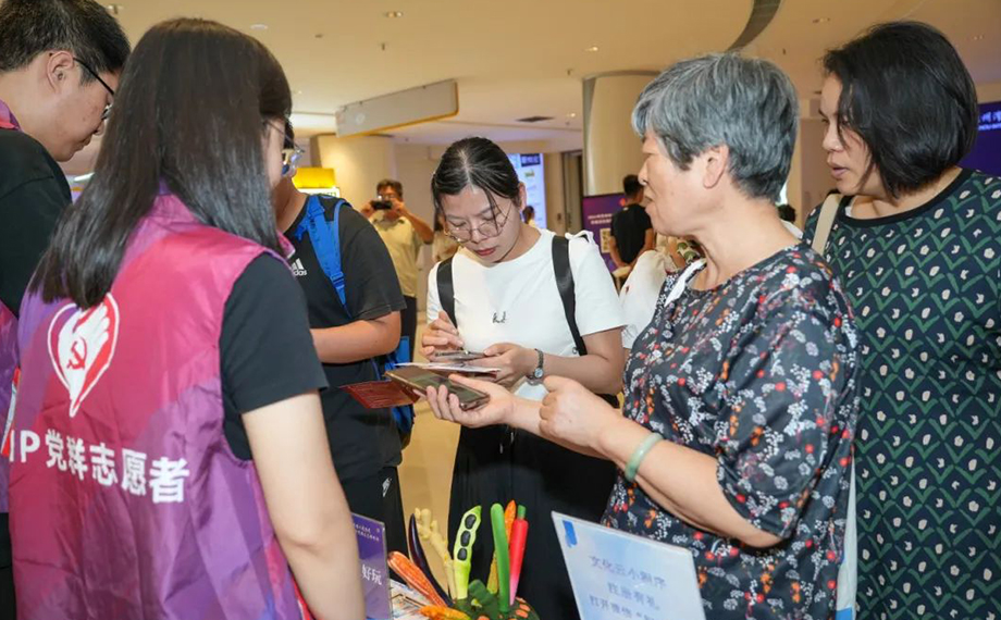 在園區公文中心服務點位前,黨員志愿者邀請現場市民共同暢游文化服務的云端驛站——2.0版本“文化云”小程序。云看展、云賞藝、云悅讀、云賽場等一站式“可看、可約、可互動”的線上文化大餐讓人眼前一亮,帶來了優質的文化體驗。