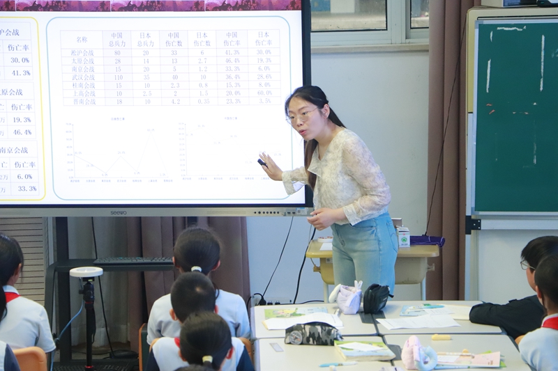 南京市金陵小學張祎寧老師執教的《數說“抗日戰爭”》將數學與歷史學科相融合通過對抗日戰爭中物資產量、兵力部署傷亡比例等關鍵數據的深入分析,將歷史事件量化為可計算、可比較的數學問題,讓學生在數學學習中銘記歷史、珍愛和平,使數學課堂成為歷史教育的生動載體